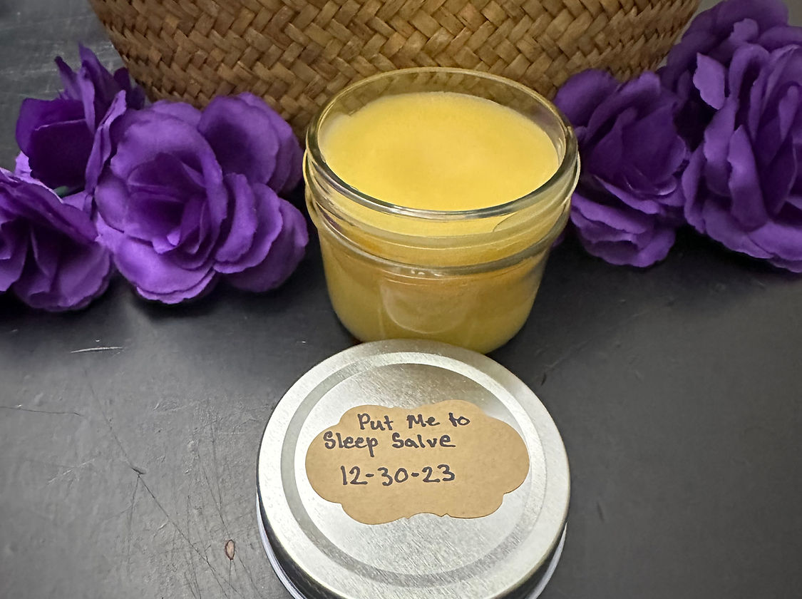 Introducing our Insomnia Salve, a natural and effective remedy for sleepless nights. We've infused 10 different herbs known for promoting sleep into nourishing avocado oil. To enhance the calming experience, we've added lavender and chamomile for their soothing and relaxing effects. Simply apply the salve to your temples, chest, and wrists before bed to ease into a restful night's sleep. Wake up feeling refreshed and ready to take on the day with our Insomnia Salve.